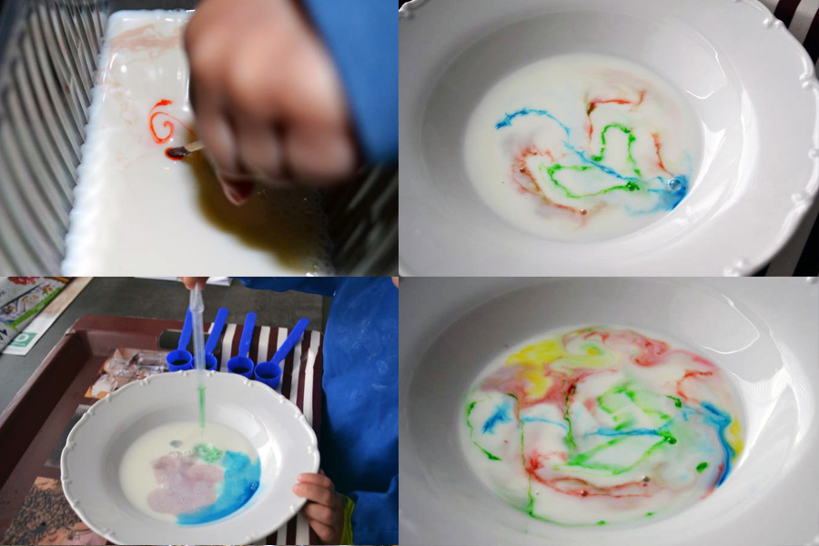 Mlieko nalejte do misky, či taniera. Potravinárske farby, buď priamo naberajte so špajdľou, alebo rozrieďte vodou a naberajte pomocou pipety. So špajdľou môžete tvoriť rôzne obrazce, s pipetou je to najmä o zručnosti a trpezlivosti dieťaťa. Pri hre sa tiež učí farby a ich miešanie. Vyskúšajte aj inú alternatívu. Tanier mlieka, do ktorého nakvapkáte potravinárske farby a potom trošku nalejte tekutého mydla na ruky. Mydlo začne v mlieku hneď reagovať a farby sa začnú miešať.