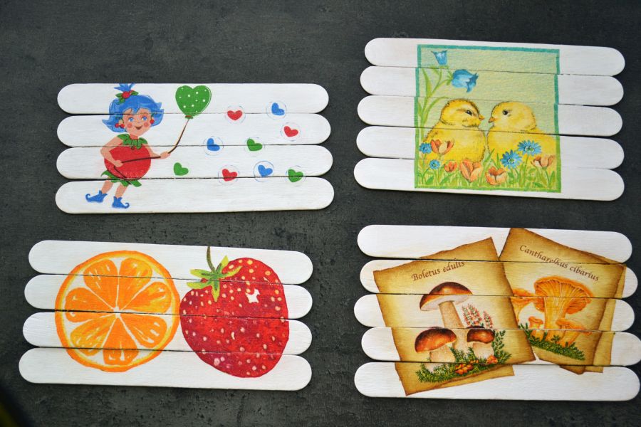 Tieto puzzle sú vyrobené pomocou servítkovej techniky. Puzzle pre najmenších z lekárskych paličiek. Sú ľahké, pozostávajú z 3-5 časti. Nemusíte použiť servítkovú techniku, stačí namaľovať jednoduchý obrázok napríklad domček, kvietok, auto, ovocie. Prvé puzzle by mali byť jednoduché na pochopenie, veľký obrázok bez rušivých elementov.