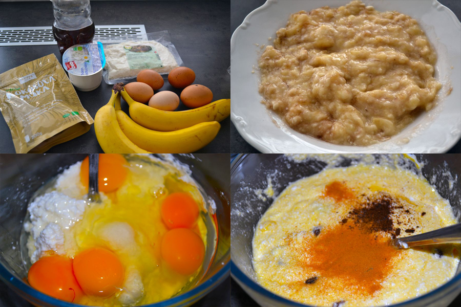Do misky dáme jemný i hrudkový tvaroh, ktorý dobre rozmiešame, pridáme kokosovú múku, hrozienka, ktoré predtým namočíme do teplej vody. V druhej misky rozmiešame vajíčka, med, pridáme škoricu, vanilku a roztlačené banány. Zmes spojíme a premiešame. Vylejeme do silikónovej bábovkovej formy. Vložíme do vyhriatej rúry a pri 170 stupňov pečieme 35minút.