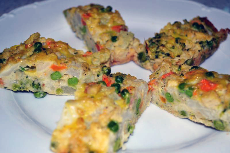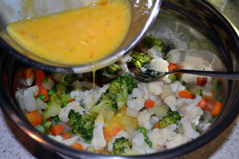 V slanej vode uvaríme karfiol a brokolicu rozdelené na malé ružičky. Očistenú a nakrájanú na kocky koreňovú zeleninu dáme variť zvlášť do osolenej vody. Tesne predtým ako vylejeme vodu z koreňovej zeleniny môžeme pridať hrášok, aby sa aspoň zohrial. Všetko dáme do jednej misky, pridáme 3 rozšľahané vajcia, krupicu, korenie a soľ. Nakoniec to zahustíme strúhankou a jemne premiešame. Zmes je ideálne dať do kruhovej formy, keďže som ju nemala dala som to jednoducho na plech, ktorý bol vymastený a vysypaný strúhankou. Dáme piecť do predhriatej rúry na 175 C asi na 45 minút.